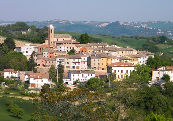 Serrungarina has a circular plant and it is completely enclosed by an imposive circle of wall. You can reach the little square and the church of Sant’Antonio Abbate - hosting some famous paintings by Guerrieri e Persiutti, beside the mechanized nativity scene (staged from Christmas until Easter) - through its characteristic staircase. Serrungarina is famous for the production of Cartoceto olive oil, and it ranks as the first producer of the Angelica pear in the world.